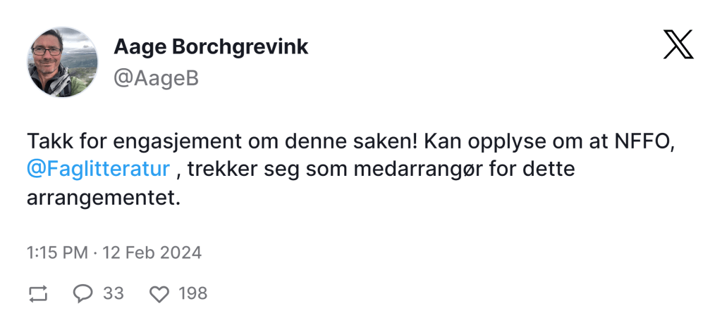 …….. announced that they cancelled their participation as a co-organiser for a public debate about the conflict in the Middle East because I am one of the speakers. I wear this as a badge of honour. One of Norway’s leading propagandists who has been writing hit-pieces about me for years in the media just happens to be a chairman of NFFO who announced the cancellation. So, the person behind the organisation that cancelled their participation, because I am allegedly controversial, is the same person who has been working tirelessly to depict me as controversial to have me fired as a professor from the university. These are two cheeks of the same arse, but this is conveniently omitted by those reporting on this story.